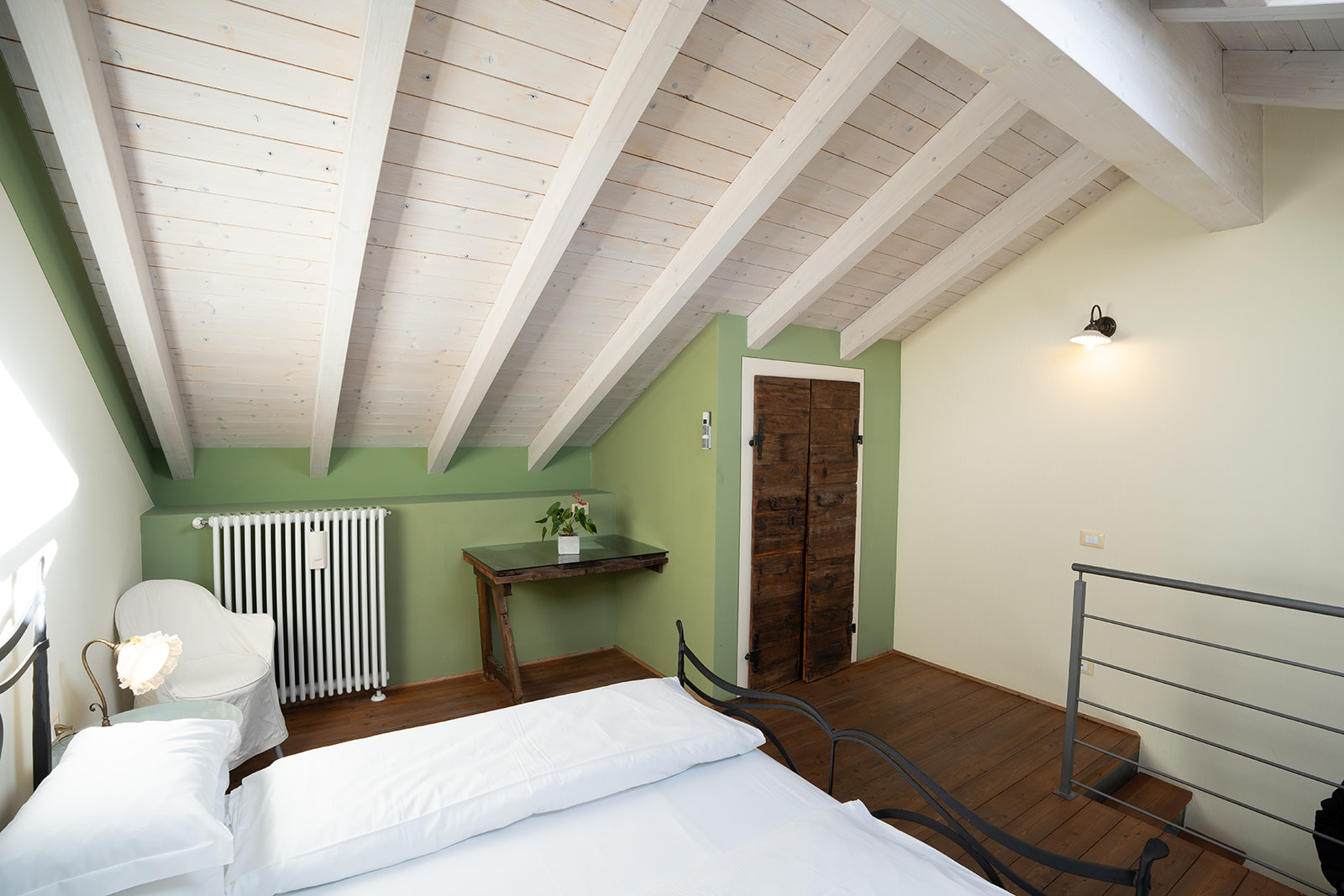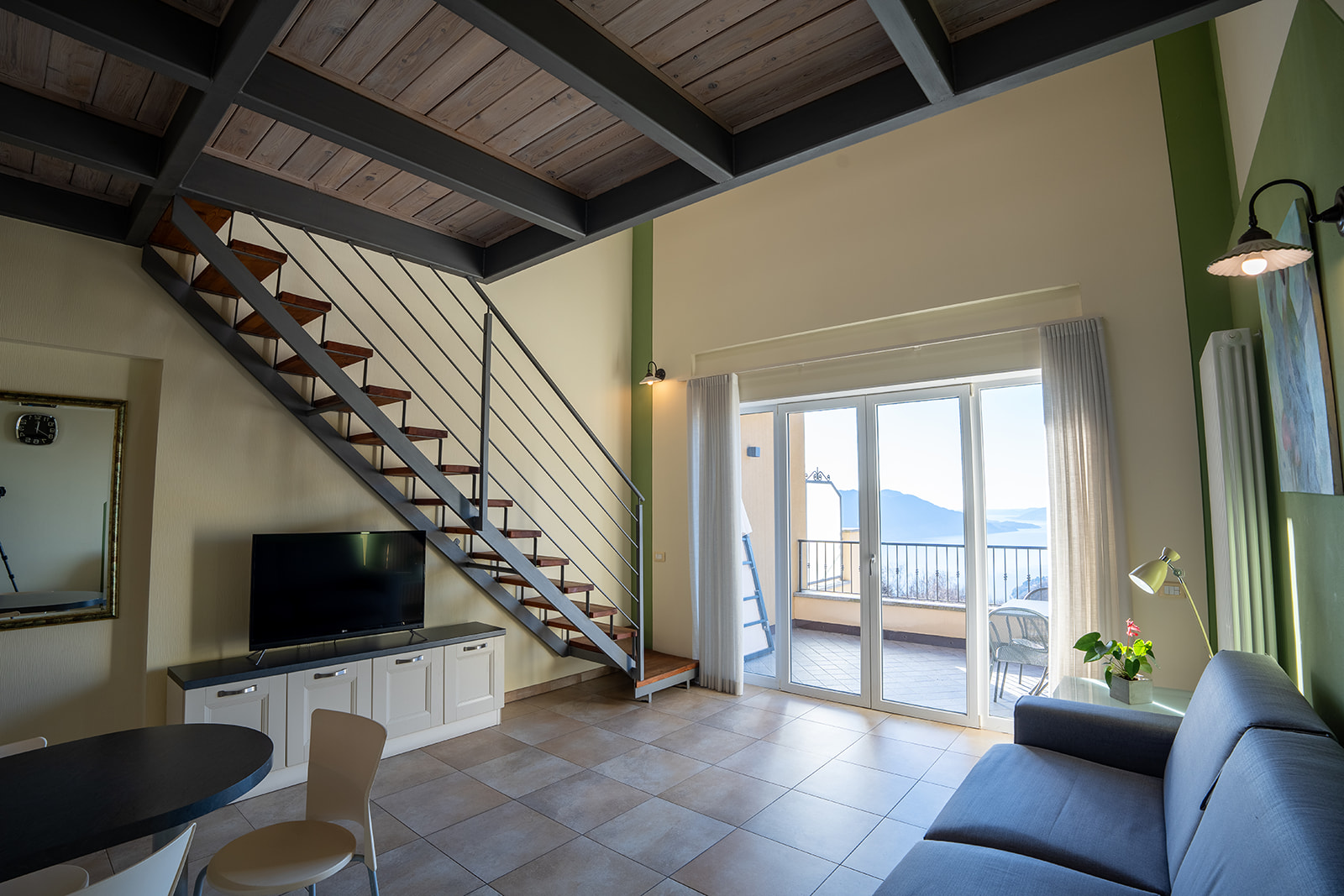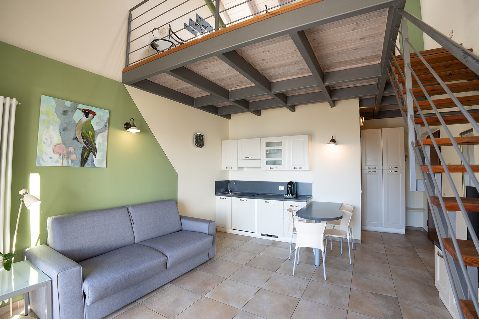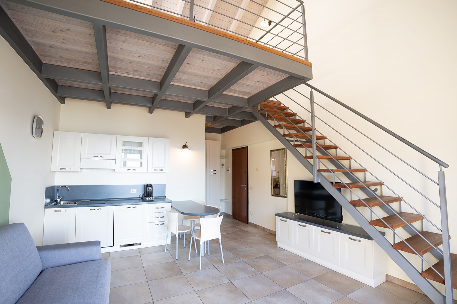 Appartamento su due livelli perfetto per famiglie, con camera separata, zona giorno con angolo cottura e un’area notte su soppalco o secondo livello pensata per i bambini. La terrazza panoramica offre spazi esterni per pranzi e relax, mentre i servizi comuni (lavanderia, parco giochi, parcheggio) rendono il soggiorno comodo e pratico per tutta la famiglia.
